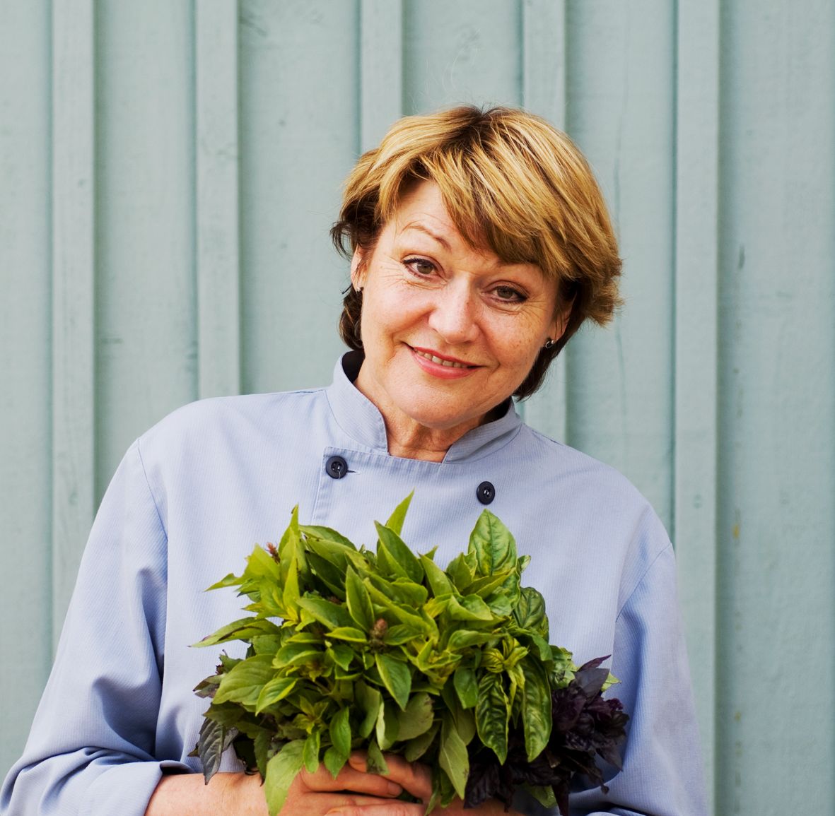 "Att de gröna bladen trivs ihop med tomater är självklart. Men jag tycker också om att para ihop den mjuka basilikasmaken med gröna äpplen och lime. Basilika betyder sommar för mig. Jag varvar de blanka bladen med nyplockade tomater och ringlar över lite fin olivolja. Det blir flera skördar varje sommar. En del av alla bladen använder jag direkt och resten fryser jag in i plastpåsar. På vintern kan jag ta en näve basilika från frysen och mixa till en pesto eller blanda ner i ett örtsmör."